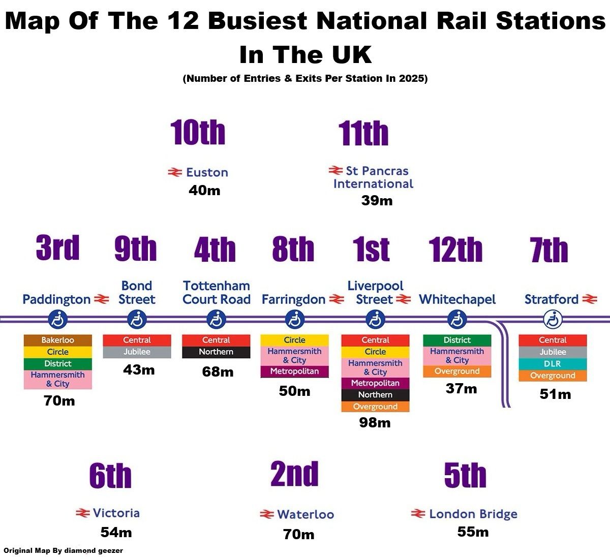 Map Of The 12 Busiest National Rail Stations In The UK Based On Entries & Exits In 2025