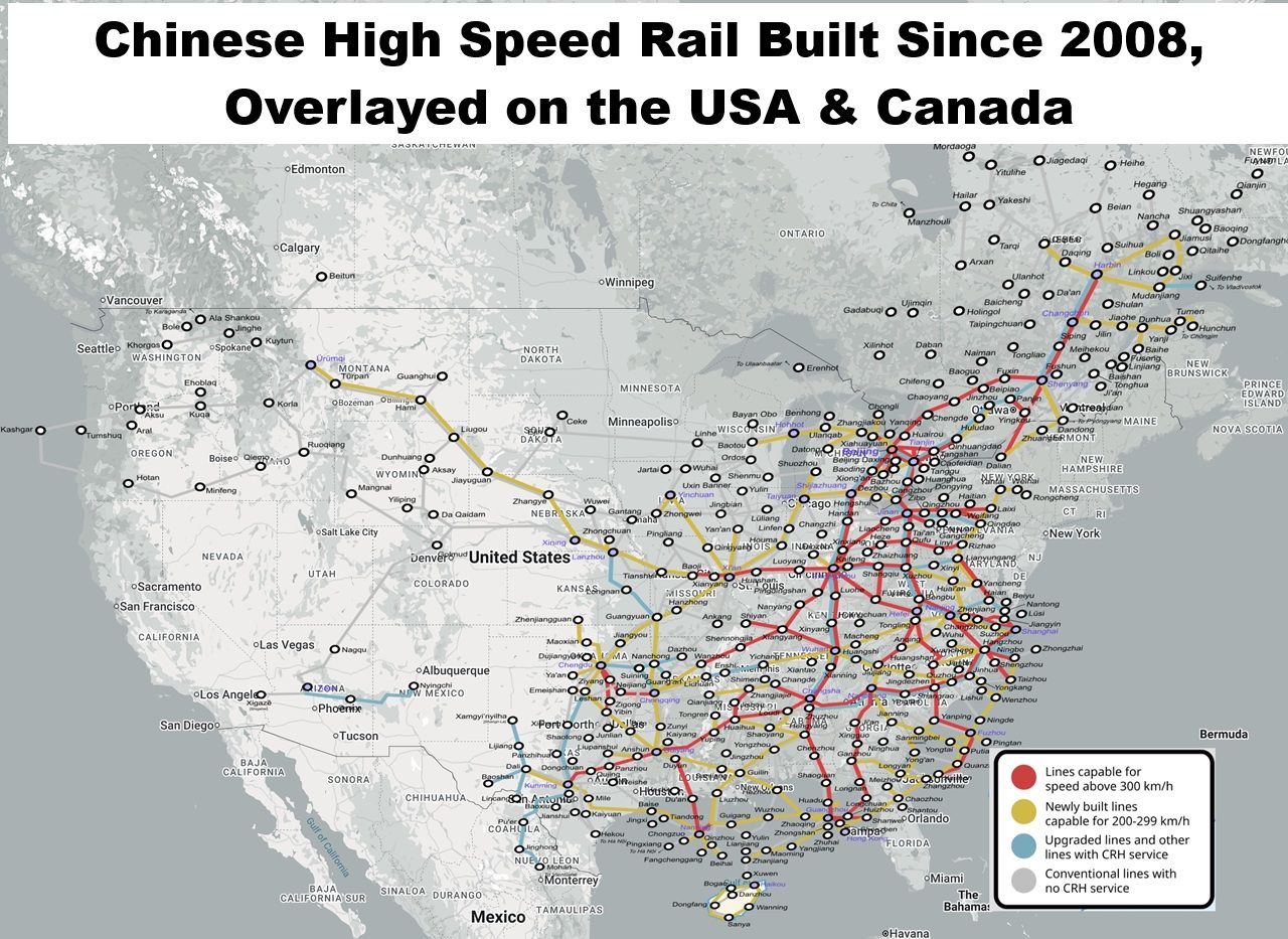 Chinese High Speed Rail built since 2008, overlayed on the USA and Canada