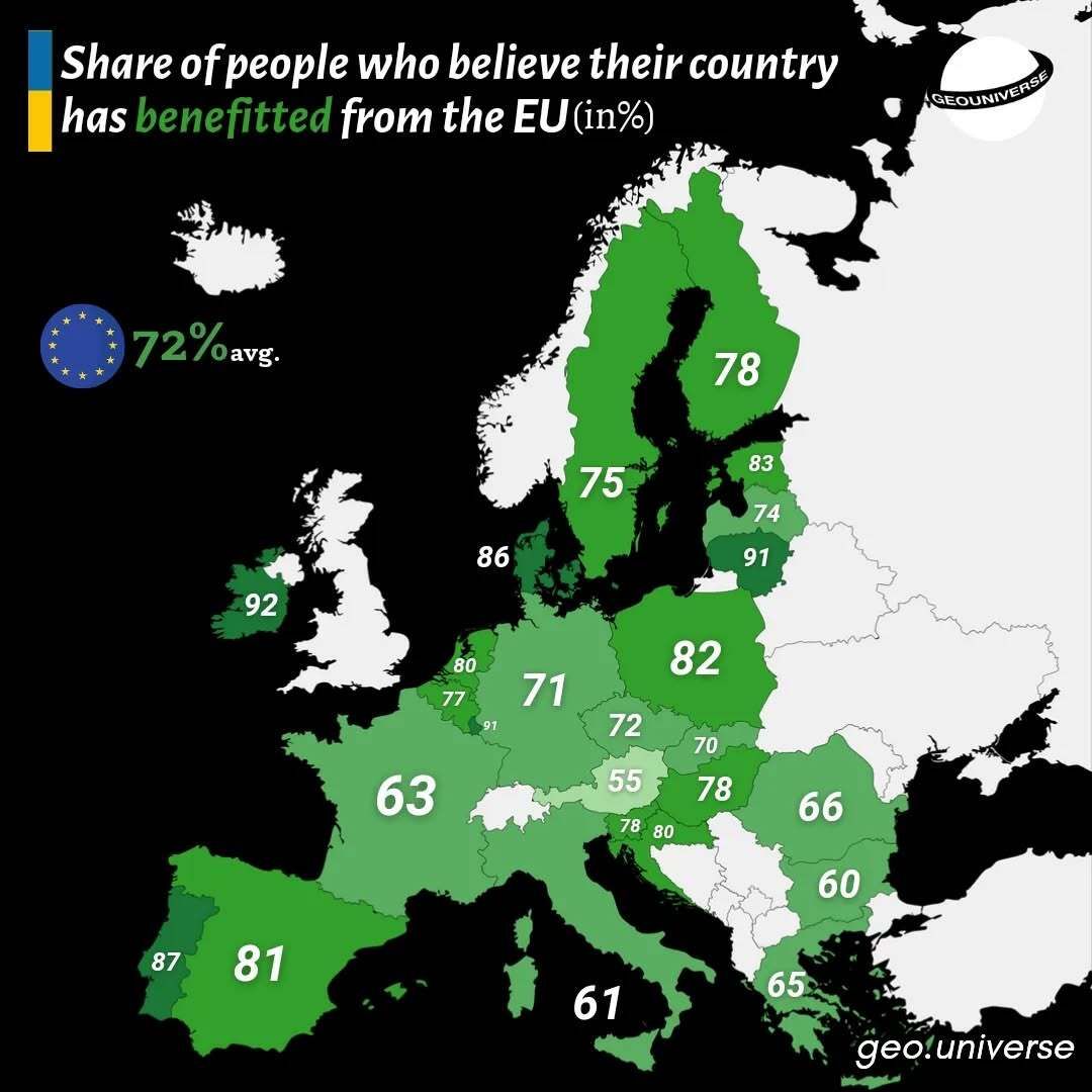 Percentage of People That Think Their Country Has Benefited From Being In The EU