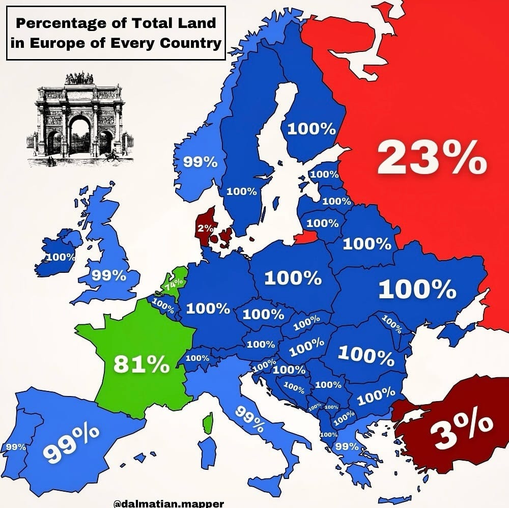 Percentage of Each European Country’s Land That Is Actually in Europe