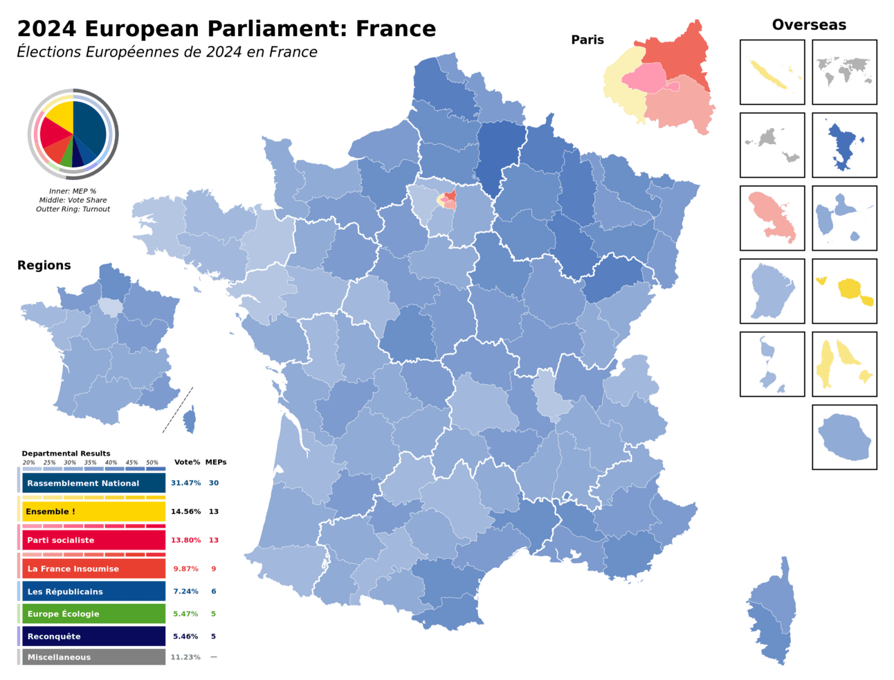 2024 European Parliament election results in France (Blue is Marine Le Pen's Rassemblement National party)